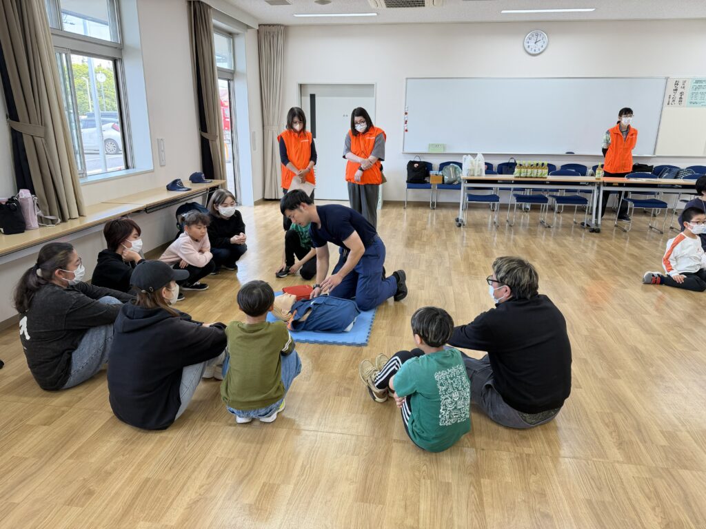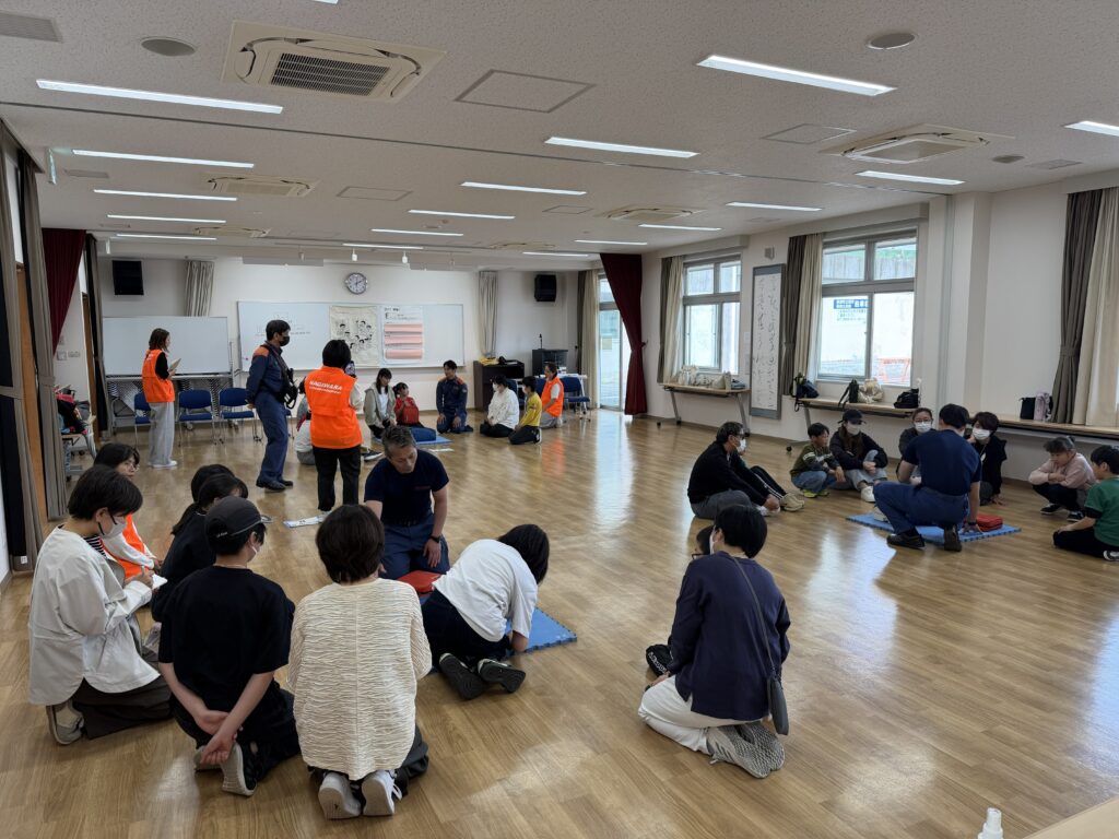 第1部の救急法では、萩原消防署員の皆様のご協力のもと、参加者を3グループに分け、AEDの取扱いや心肺蘇生法について学びました。大人も子どもも真剣に話を聞きながら、実際にAED操作や胸骨圧迫を体験し、命を守るための大切な知識と技術を身につけることができました。質問も多く出され、非常に充実した研修となりました。